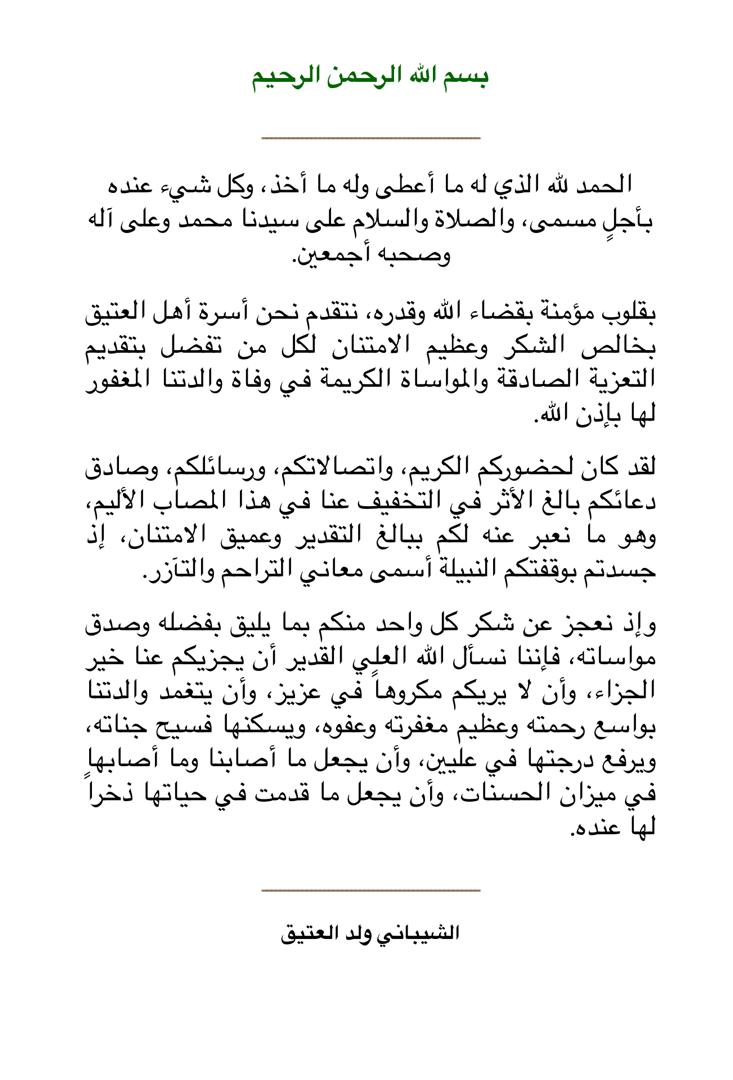 تقدمت أسرة أهل العتيق بخالص الشكر وعظيم الامتنان لكل من قدم لهم التعزية الصادقة والمواساة الكريمة في وفاة والدتهم المغفور لها بإذن الله، سواء بالحضور أو الاتصال أو عبر الرسائل وصادق الدعاء.