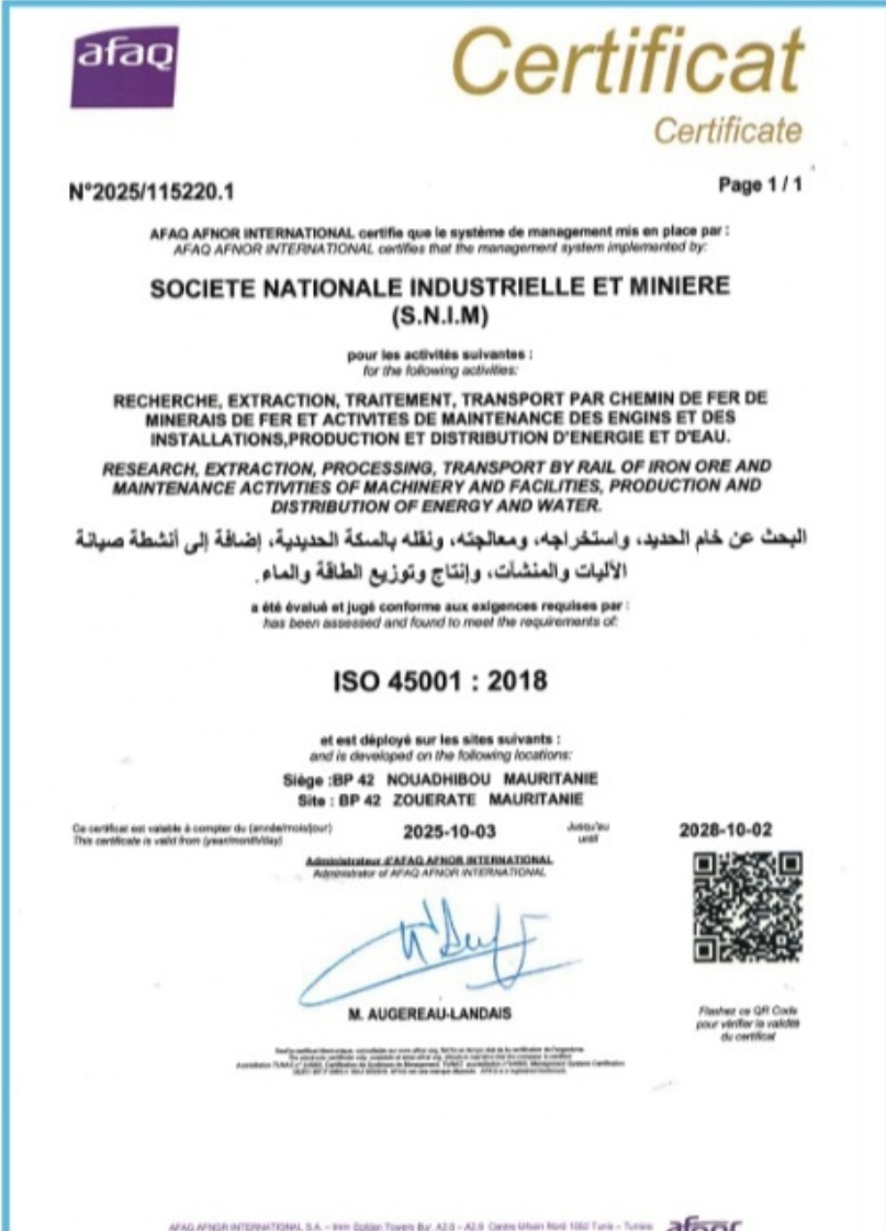 وذكرت النشرية أن هذا الاعتراف الدولي المرموق جاء بعد عملية تدقيق شاملة أجرتها مؤسسة AFNOR Certification الفرنسية خلال الفترة ما بين 15 و26 سبتمبر 2025، حيث تم تقييم نظام "سنيم" للسلامة والصحة المهنية وفق أعلى المعايير الدولية.